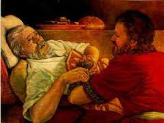 Entonces le dijo: “¿Eres tú de veras mi hijo Esaú?” Respondió Jacob: “Sí, yo soy”. Le dijo Isaac: “Acércame lo que has cazado para que coma y después te bendiga”. Jacob le acercó el guisado y el padre comió; también le trajo vino y bebió.Entonces le dijo Isaac a Jacob: “Hijo, acércate y bésame”. Él se acercó y lo besó; y al aspirar Isaac el olor de su ropa, lo bendijo, diciendo: