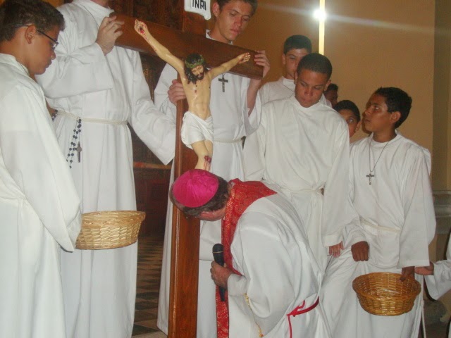 4. El sacerdote y el diácono, revestidos de color rojo como para la Misa, se dirigen al altar, y hecha la debida reverencia, se postran rostro en tierra o, si se juzga mejor, se arrodillan, y todos oran en silencio durante algún espacio de tiempo.
