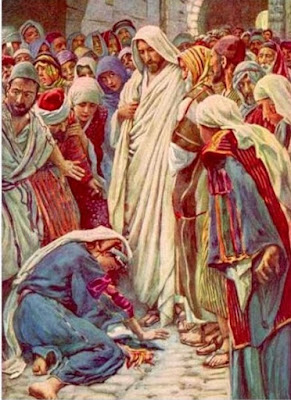 Jesús notó al instante que una fuerza curativa había salido de Él, se volvió hacia la gente y les preguntó: “¿Quién ha tocado mi manto?” Sus discípulos le contestaron: “Estás viendo cómo te empuja la gente y todavía preguntas: `¿Quién me ha tocado?’ ” Pero Él seguía mirando alrededor, para descubrir quién había sido. Entonces se acercó la mujer, asustada y temblorosa, al comprender lo que había pasado; se postró a sus pies y le confesó la verdad. Jesús la tranquilizó, diciendo: “Hija, tu fe te ha curado. Vete en paz y queda sana de tu enfermedad”.